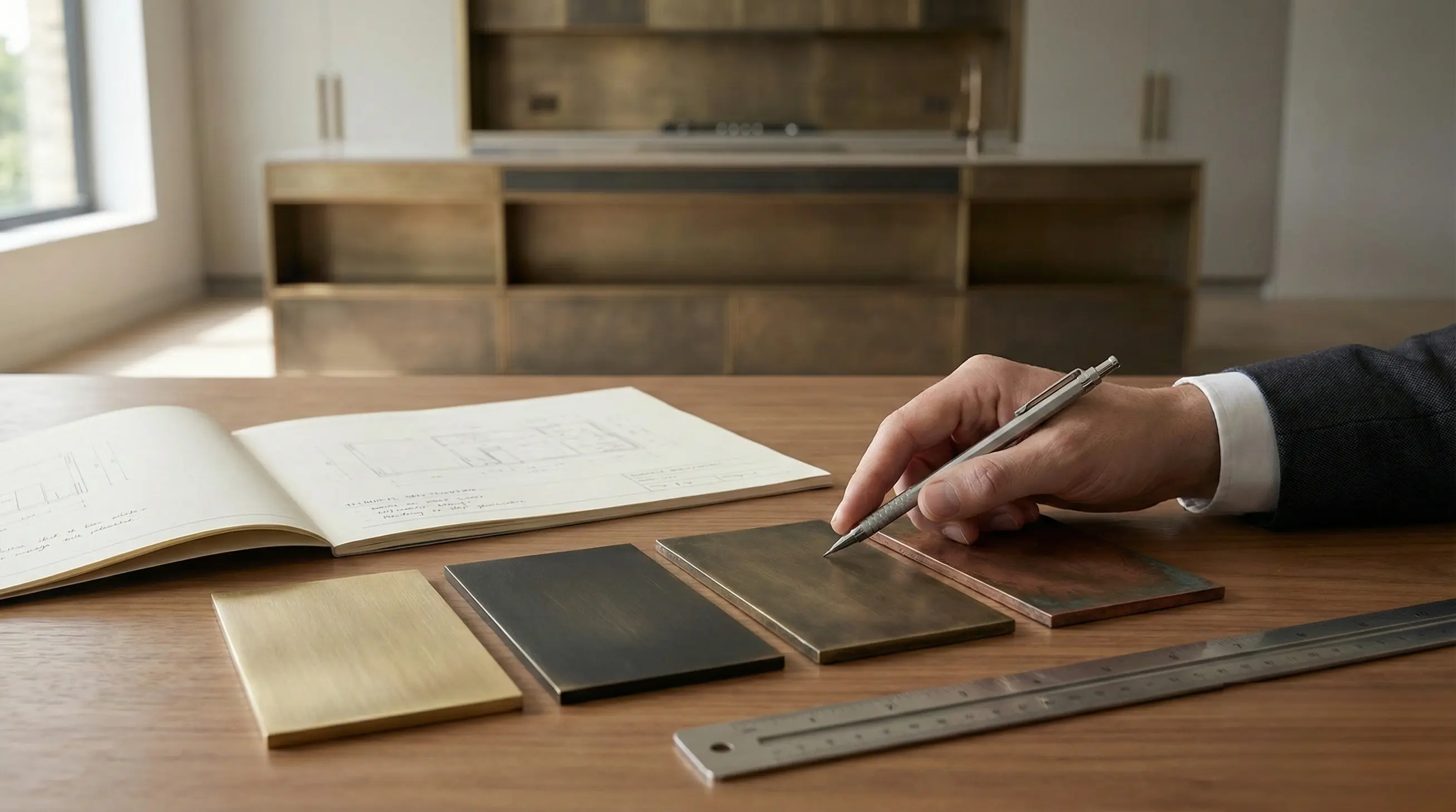 Buildability matters here. The finish strategy is chosen to reduce the visual penalties of fabrication, especially at transitions where joints, folds, or bends would interrupt the grain. The result is a calmer composition, where the brass supports the architecture instead of competing with it.